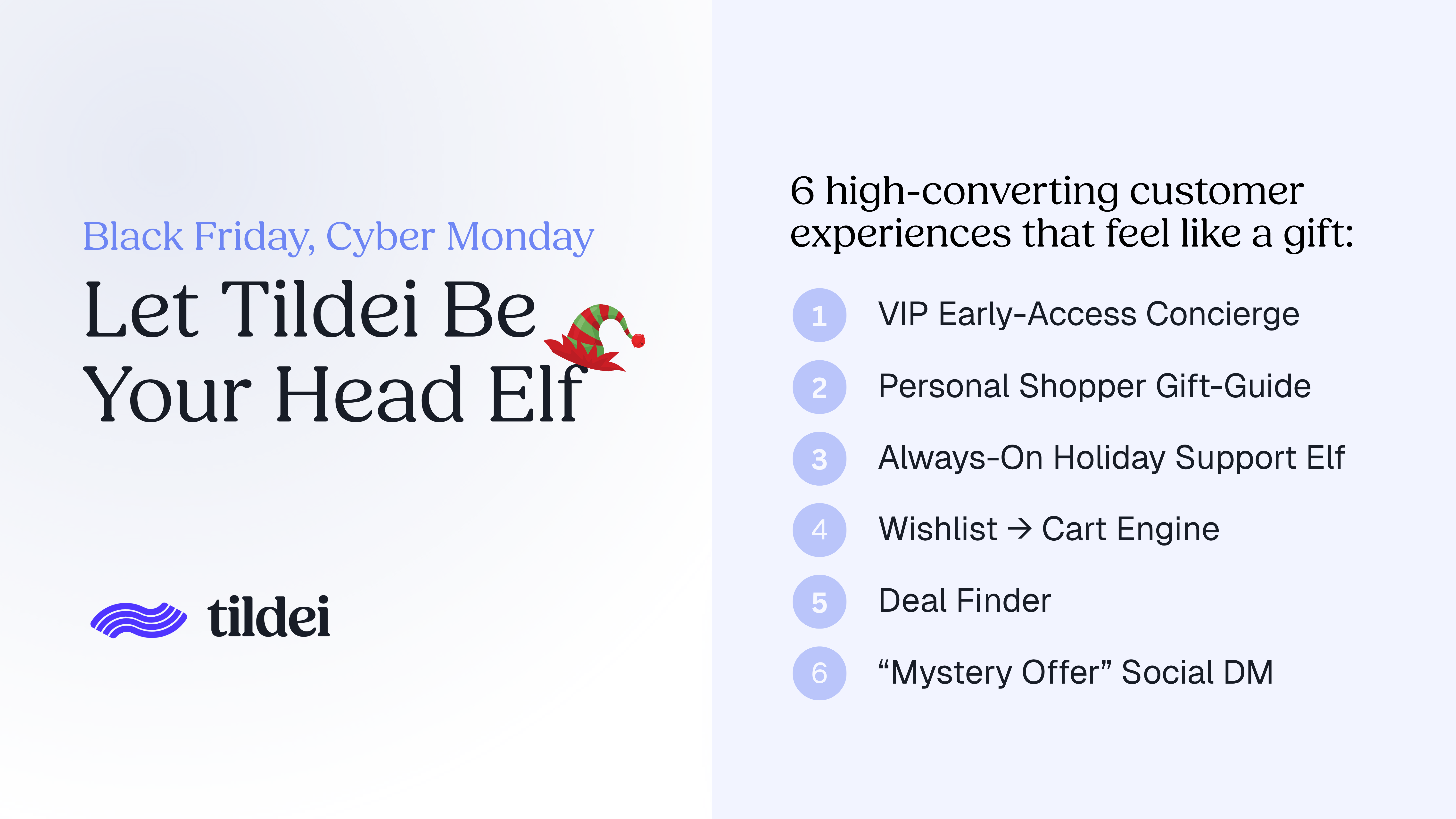 With Tildei as your Head Elf, you turn Black Friday from a hectic scramble into a seamless, personalized shopping event. One unified intelligence + many helper agents means every customer gets the right answers, suggestions, and deals exactly when they need them. You get higher conversions, larger orders, and happier customers—all while staying on-brand and cutting support costs. It’s holiday magic for your marketing.