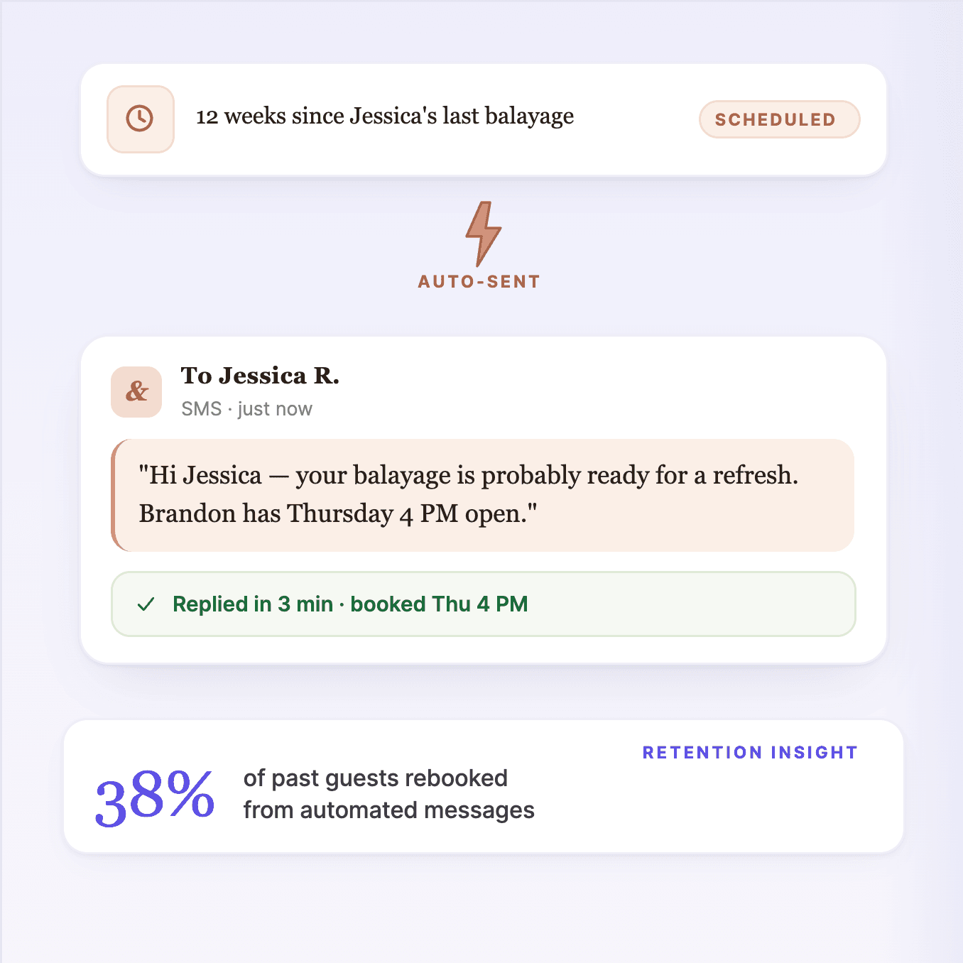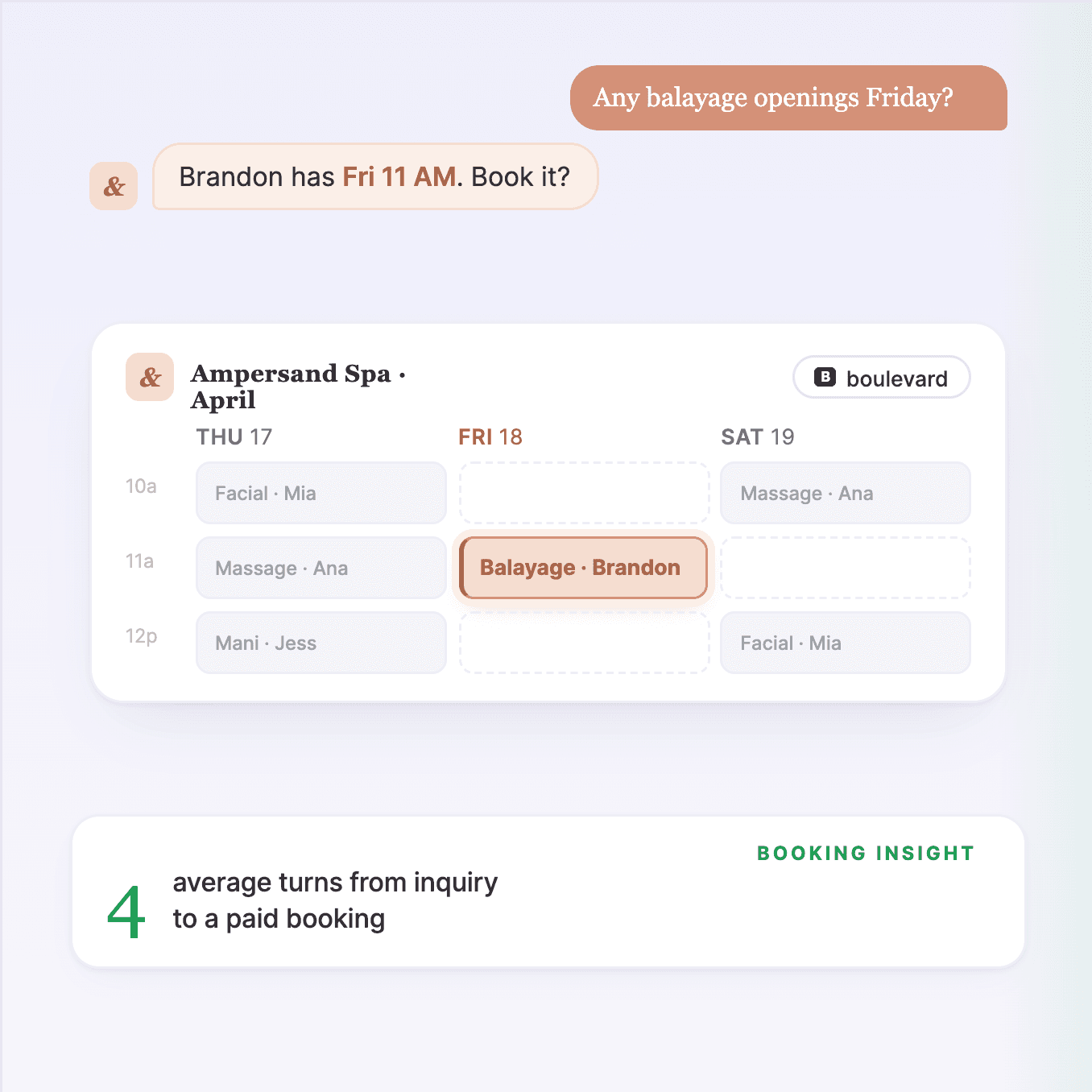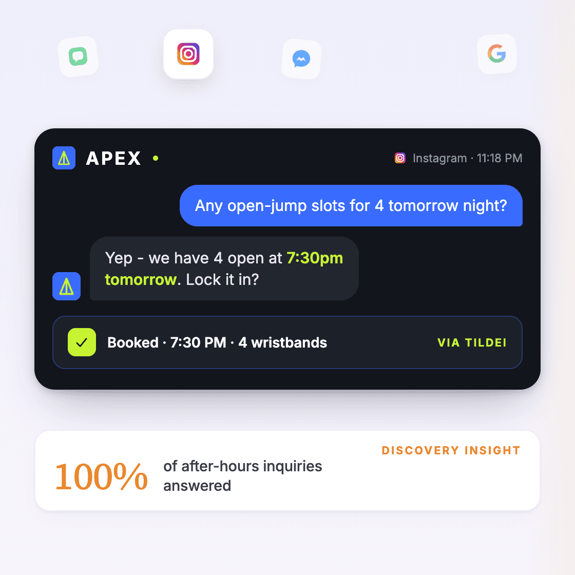 Takes customers from “Can I book a consultation?” to confirmed appointment in one natural conversation—no forms, no friction, no drop-off.