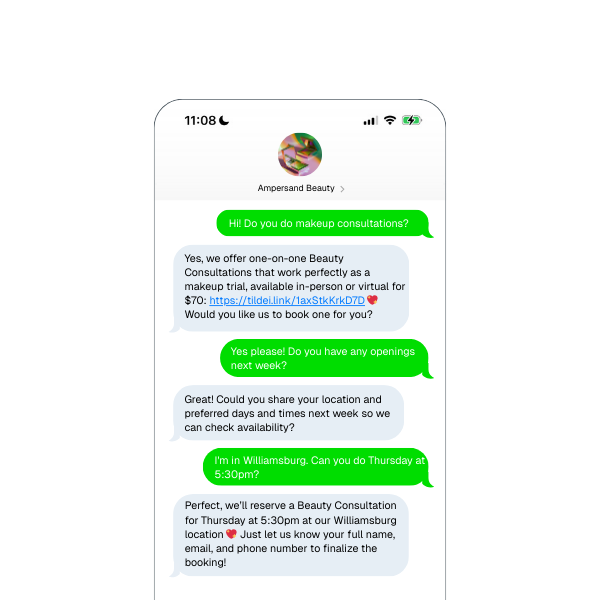 No more "here's a calendar link." The agent asks clarifying questions (bridal or everyday? in-studio or on-location?), checks real availability, and offers specific time slots that work.